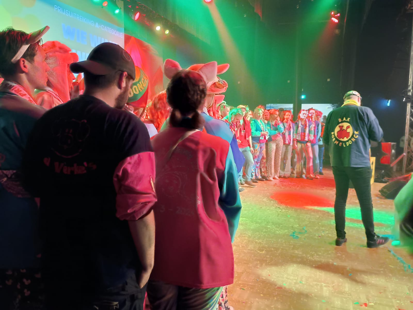 De grote zaal was bomvol met deelnemers aan de optocht en andere belangstellenden. Vooral bij de bekendmaking van de winnaars van de B- en de A-wagens.
